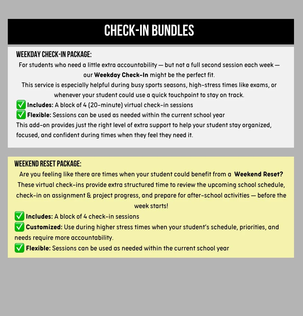 Our standard coaching plan includes 4 sessions per month, each 45 minutes long. Most students find a rhythm with one session per week, often keeping the same day and time — which builds consistency, predictability, and accountability, all key for skill development. While this routine works well for many, it isn’t mandatory. For times when extra support is needed, our new check-in bundles can be added on to the standard 4-session plan. (You can choose to add only one, as we want to support independence.)