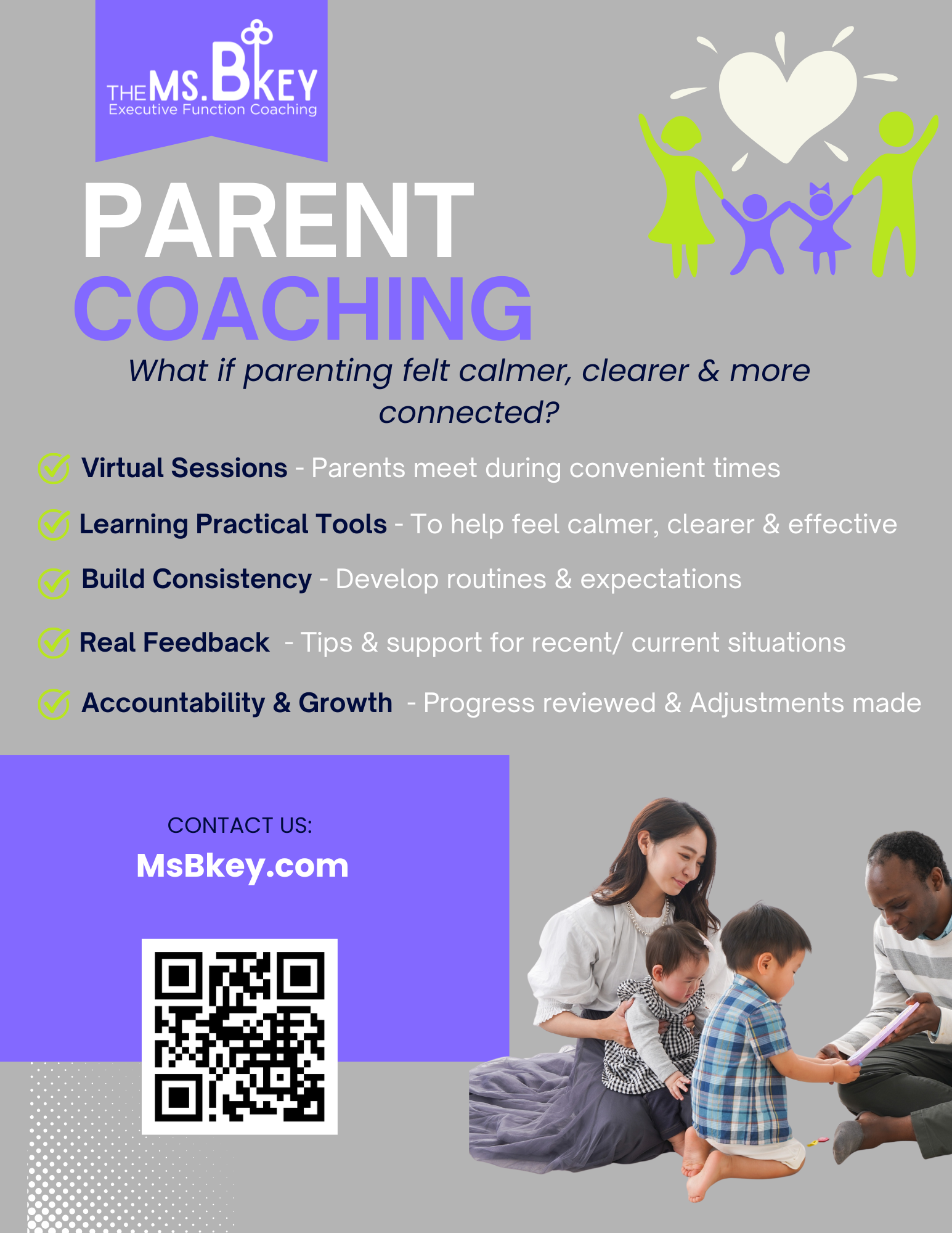 Our Parent Coaching sessions are designed to empower families with practical tools and strategies to support their child’s executive function growth at home. These sessions can be booked as standalone coaching for parents who want to better understand how to guide skills like organization, time management, and task initiation — or as add-on sessions that complement a student’s existing executive function coaching.